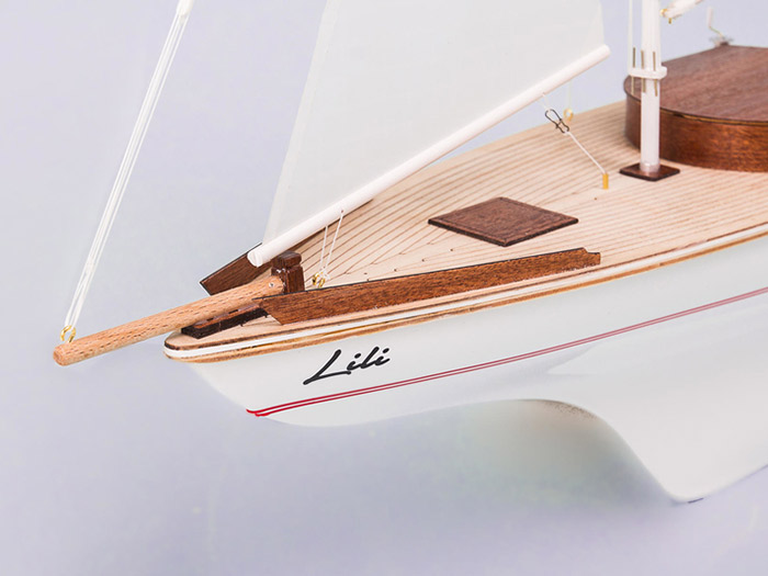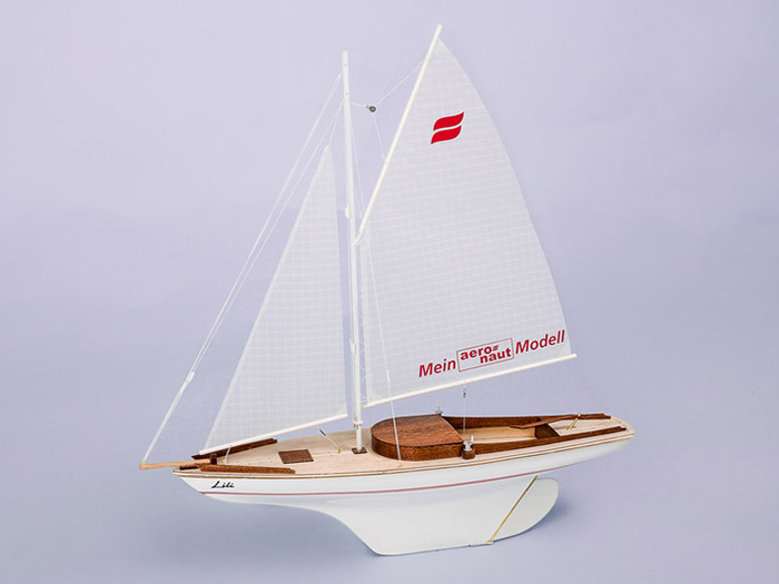 The Lili sailing boat is built on a deep-drawn plastic hull with precise laser-cut wooden parts (mahogany, birch).