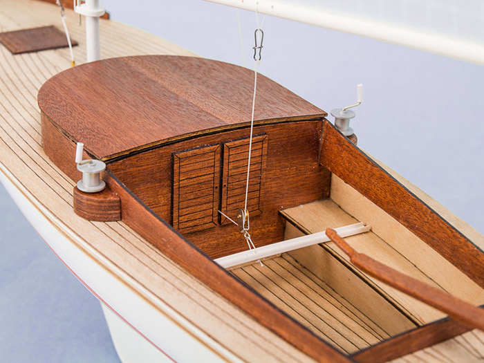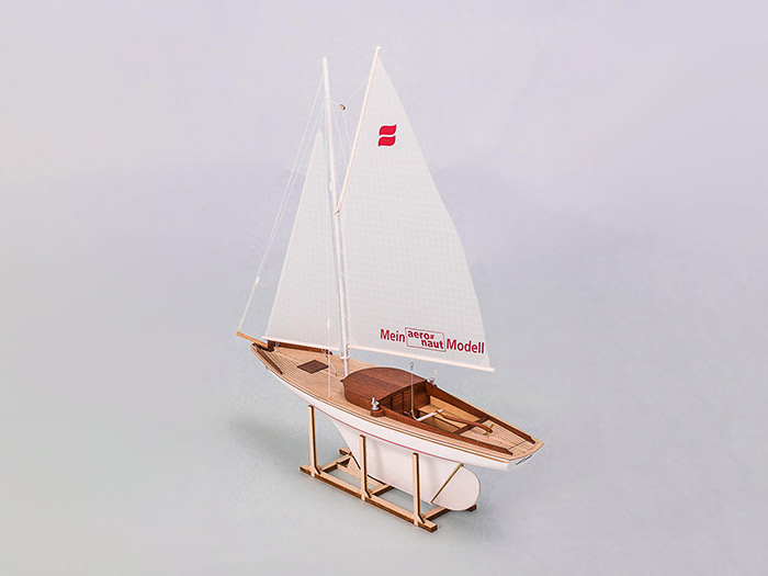 The kit is also aimed at beginners in the sailboat scene with precise fitting parts making it easy to assemble. The cockpit is assembled in one piece and then inserted into the hull and glued. The brackets for the mast are already pre-located in the deck. The deck planking is laser engraved. The boat contains many details and fittings such as blocks, winches, pulleys. A boat stand is also included.